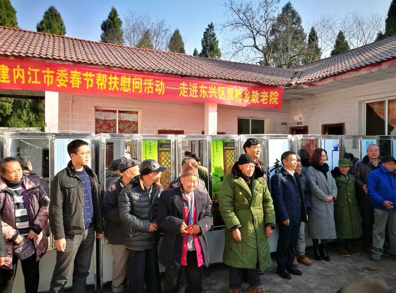 2018年1月9日下午,民建内江市委主委、市政协副主席徐进才率副主委、联系双桥镇的区领导周忠勇同志、秘书长李梅、妇委会主任雷英等一行先来到了东兴区双桥镇敬老院,看望慰问孤寡老人。徐进才实地查看了老人们的生活起居环境,详细询问了饮食、健康、文娱等情况,还专门探望了瘫痪在床的两位老人。在举行的捐赠仪式上,徐进才代表民建内江市委将会员捐赠的爱心款购买的25个防潮衣柜送到每位老人房间并发放了春节慰问金共计8300元,同时还向老人们表达了新年慰问和良好祝愿。老人们十分高兴,感谢民建的帮扶让他们感受到了来自社会的关爱和温暖。