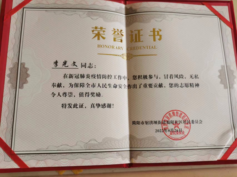 现居简阳市的民建东兴区总支部会员李光文,就地转为简阳市射洪坝街道志愿者,参与小区值守、秩序维护、物资搬运等志愿服务,获得了当地居委会颁发的抗疫先进荣誉证书。