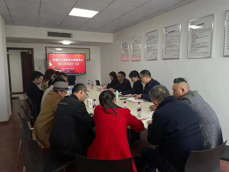 2023年3月29日,民建内江市高新总支部召开第九次支委(扩大)会议,民建内江市委主委、市政协副主席徐进才出席会议并讲话,内江高新区党群工作部部长王燕、副部长缪丹应邀出席。会议由民建内江市高新总支部主委郑常伟主持,总支部在家副主委、支委及部分骨干会员参加会议。