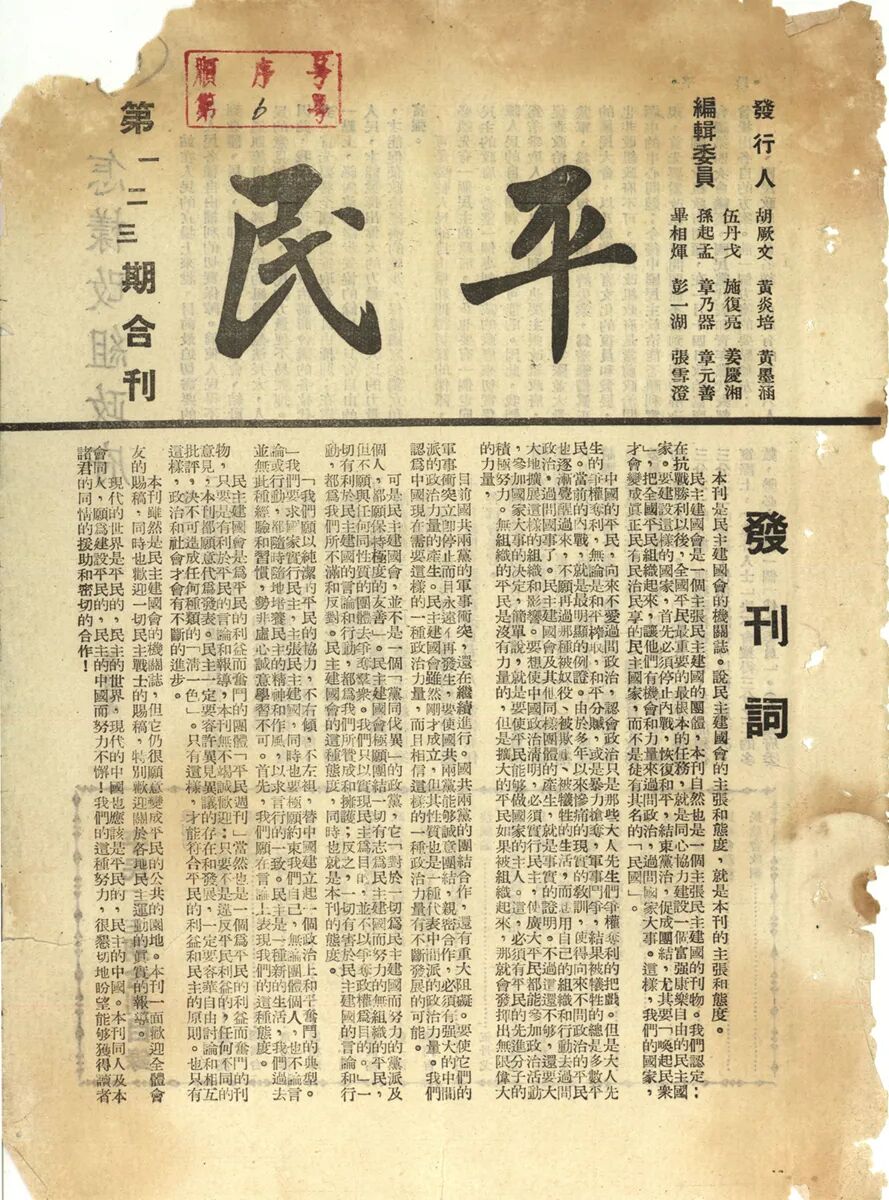 《平民》 周刊于 1946 年 1 月 12 日正式出版,共出版四期后停刊。主要刊载民建成立大会通过的重要文件和成员的政见文章。1946年4月,民建总会迁离重庆去上海,先后再版了《平民》一至四期作为资料发给会员。