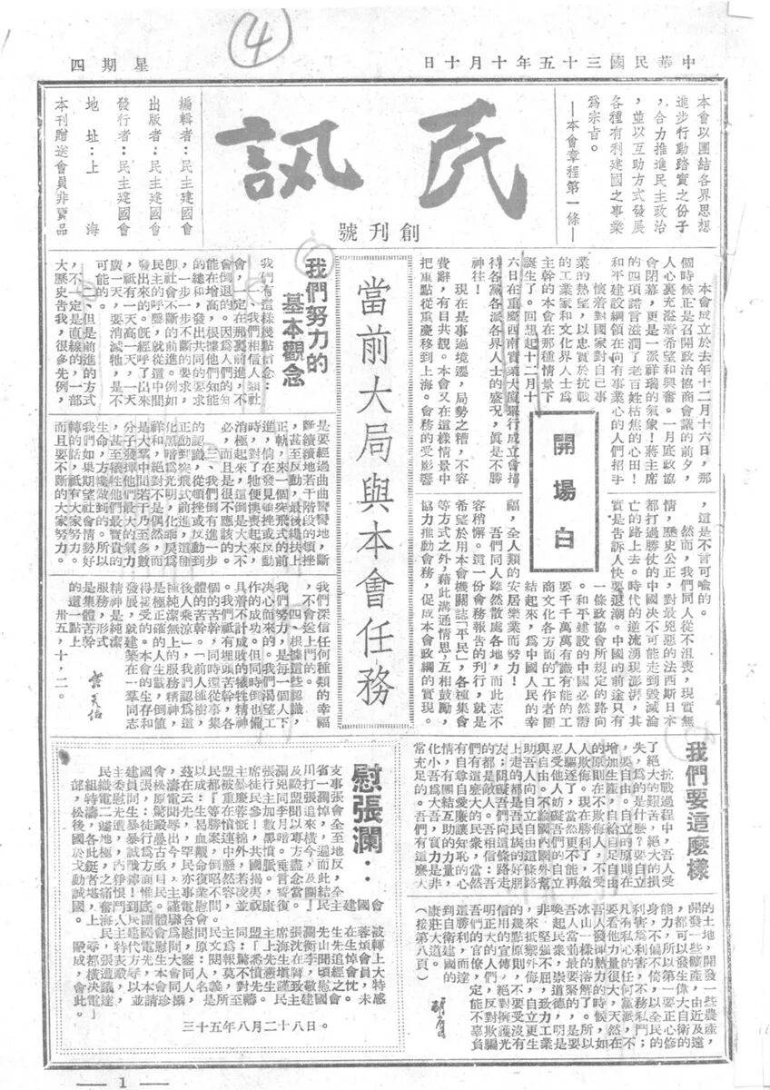 民建总会迁上海后,为了在会员之间“沟通思想,互相鼓励,协力推进会务”,于1946年10月创办了内部刊物《民讯》,分发会员,作为会务报告。到受国民党压制民建转入地下活动为止,共出版了四期。