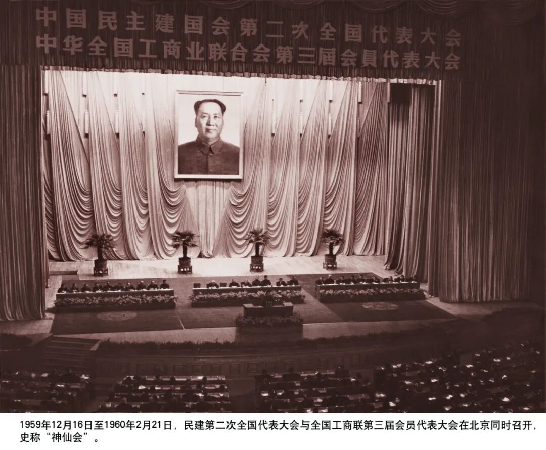 1959年12月16日至1960年2月21日,民建第二次全国代表大会与全国工商联第三届会员代表大会在北京同时召开,这是第一次联合召开的代表大会,史称“神仙会”。出席会议的有民建、工商联各级组织负责同志和工商界骨干分子近2000人。其中民建代表459人,代表135个地方组织的23900多名成员。