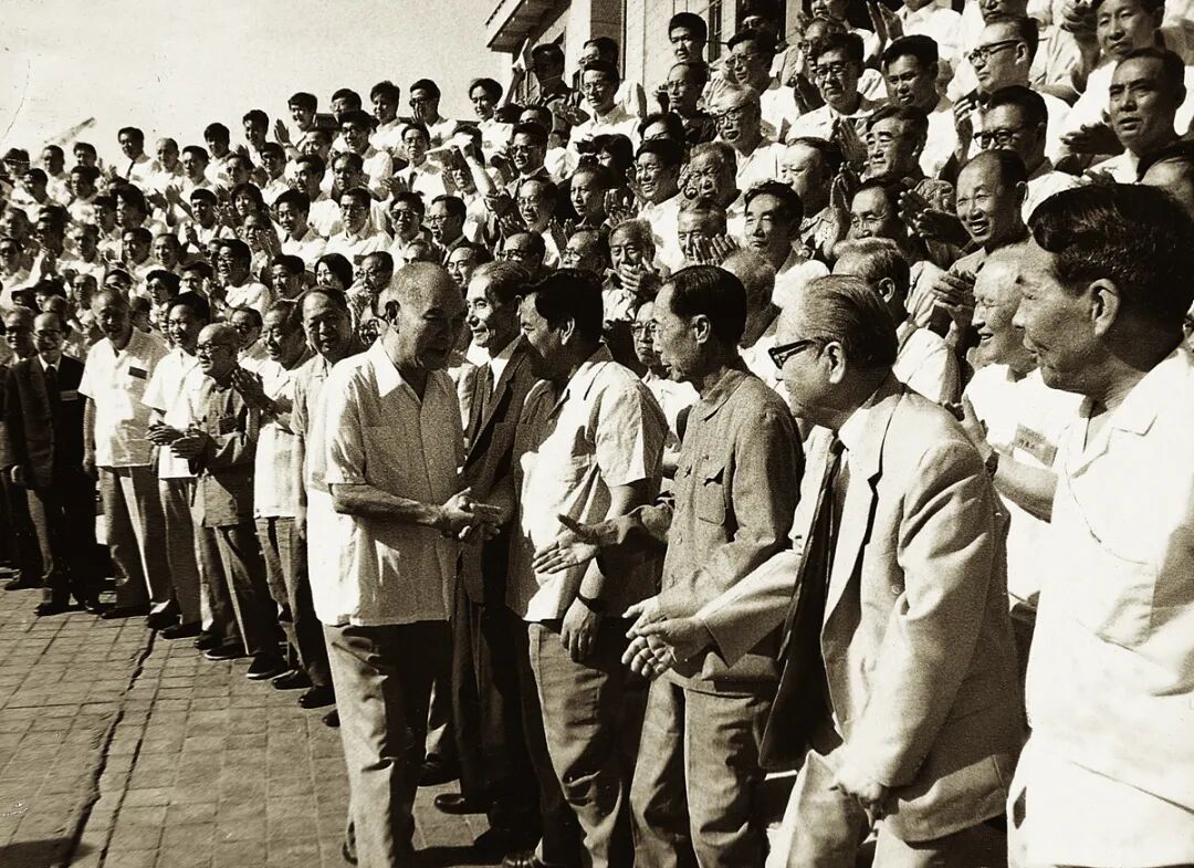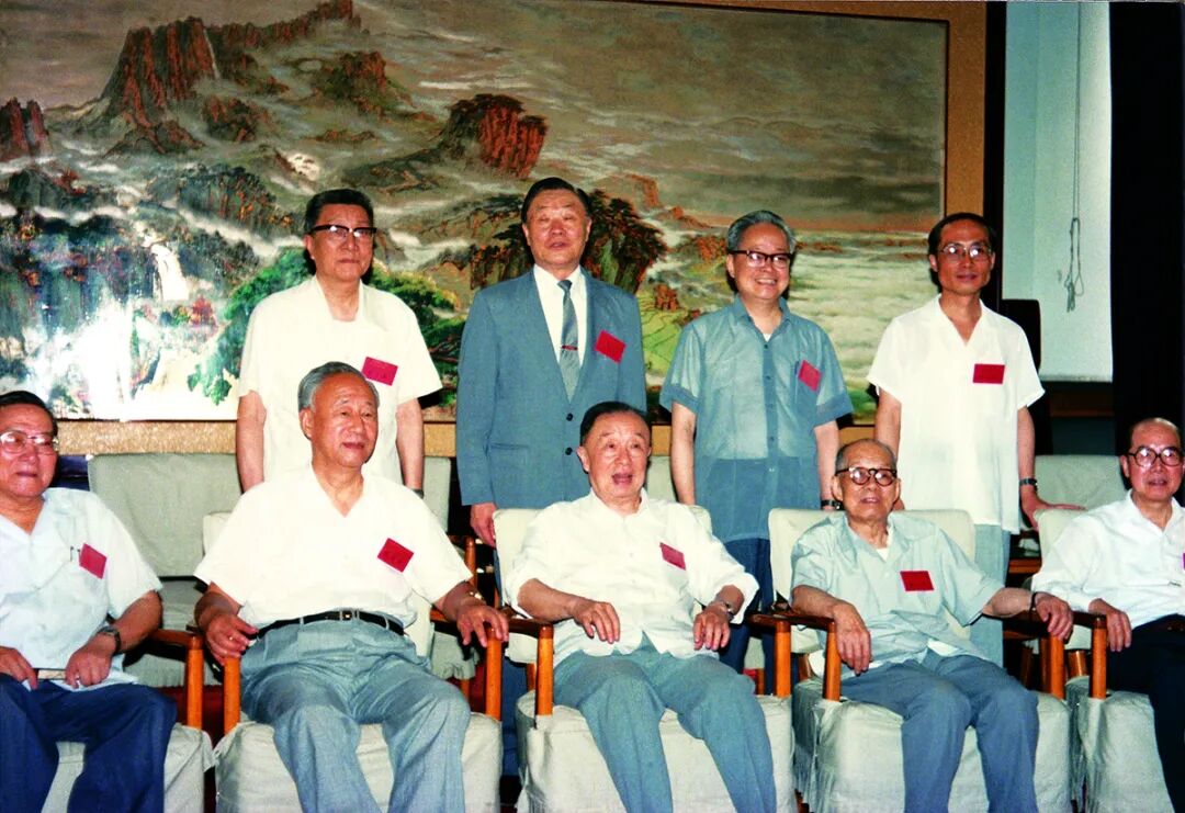 民建第五届中央委员会第一次全体会议选举产生的新一届领导人员(部分)合影。前排左起:黄大能、陈遂衡、孙起孟、汤元炳、陈铭珊,后排左起:李崇淮、万国权、冯梯云、白大华。