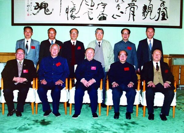 民建第六届中央委员会第一次全体会议选举产生的新一届领导人员(部分)合影。前排左起:黄大能、陈邃衡、孙起孟、陈铭珊、万国权,后排左起:刘珩、路明、白大华、李崇淮、朱元成、冯克煦。