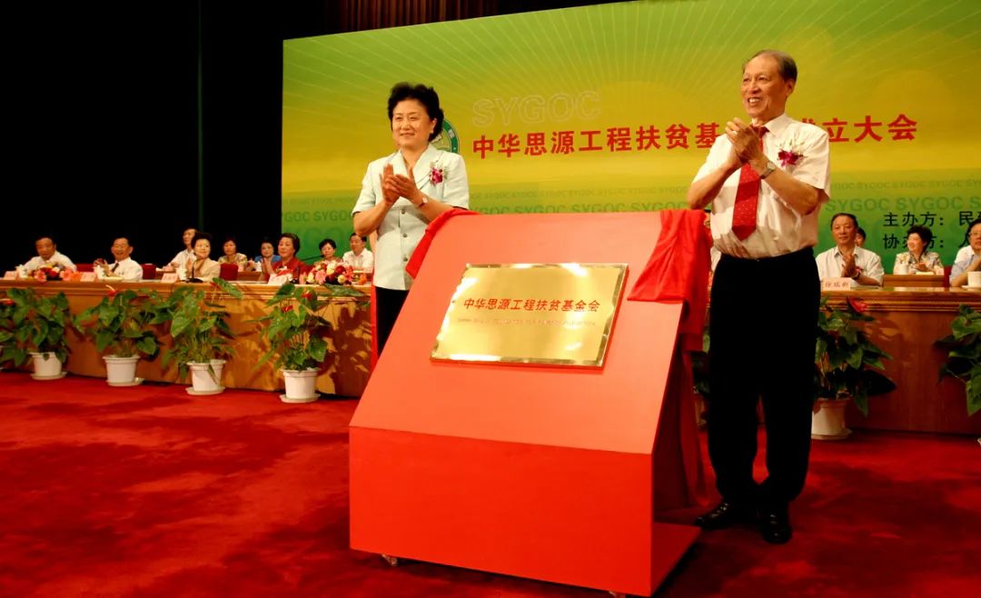 2007年7月4日,中华思源工程扶贫基金会成立大会在北京举行。图为成思危(右)与刘延东为基金会揭牌。