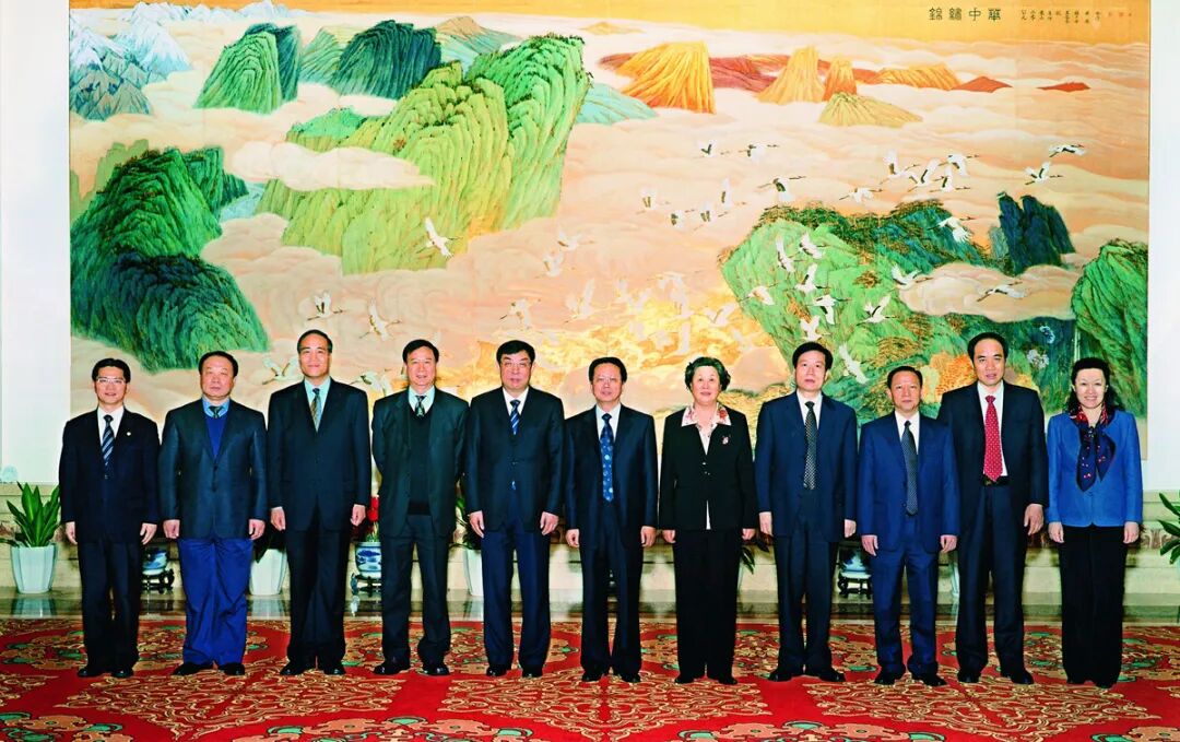 民建第九届中央委员会第一次全体会议选举产生的领导人员合影。左起:周汉民、宋海、张少琴、王少阶、马培华、陈昌智、张榕明、程贻举、陈政立、辜胜阻、李谠。