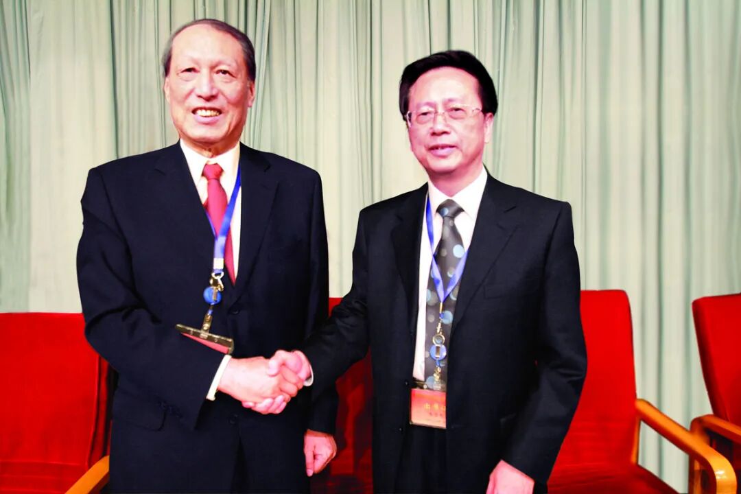 民建中央原主席成思危(左)与新当选主席陈昌智(右)亲切握手。